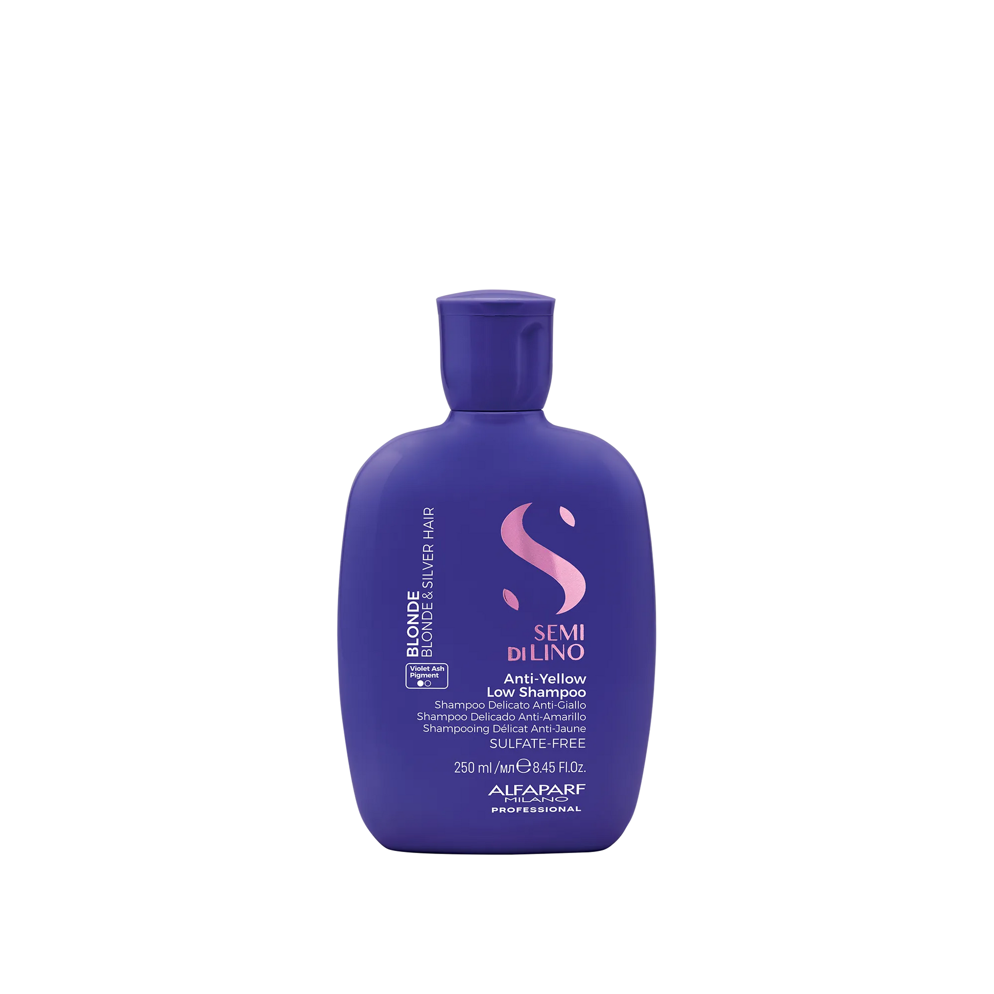 Alfaparf Milano Professional SDL Blonde Anti-Yellow Shampoo gently cleanses and neutralises unwanted yellow tones while moisturising and revitalising the hair.