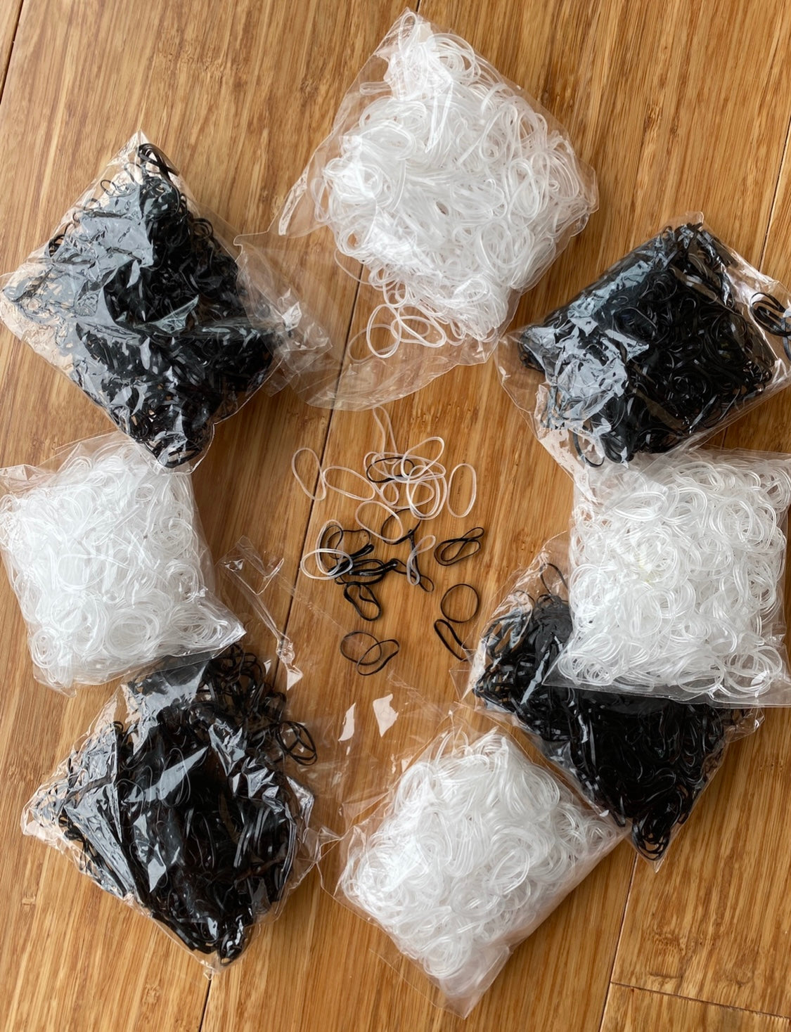 Pack of 500 disposable elastic hair bands. Available in Clear or Black