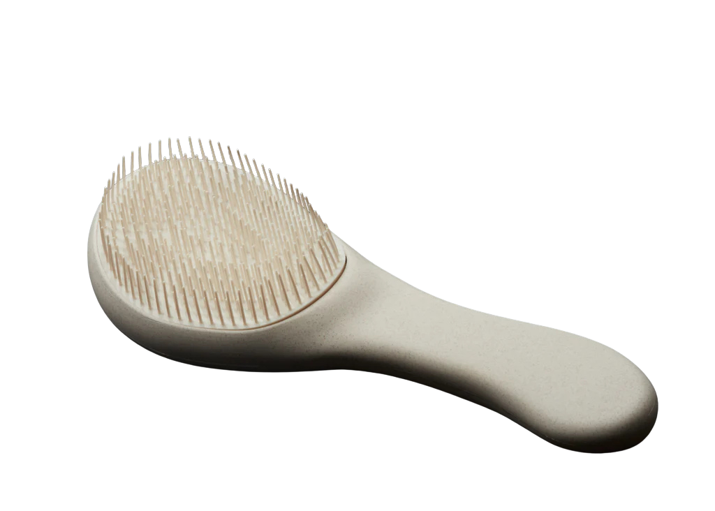 Made from 100% compressed, biodegradable natural plant starch - Maize & Casava - the curved, moulded bristles and cushioned paddle gently massage the scalp, preventing damage to the hair caused by breakage.