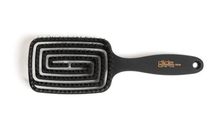The GLIDE Flexi Paddle Brush is made up of a mix of bristles and pins, designed to naturally distribute oil through the hair and gently remove knots.